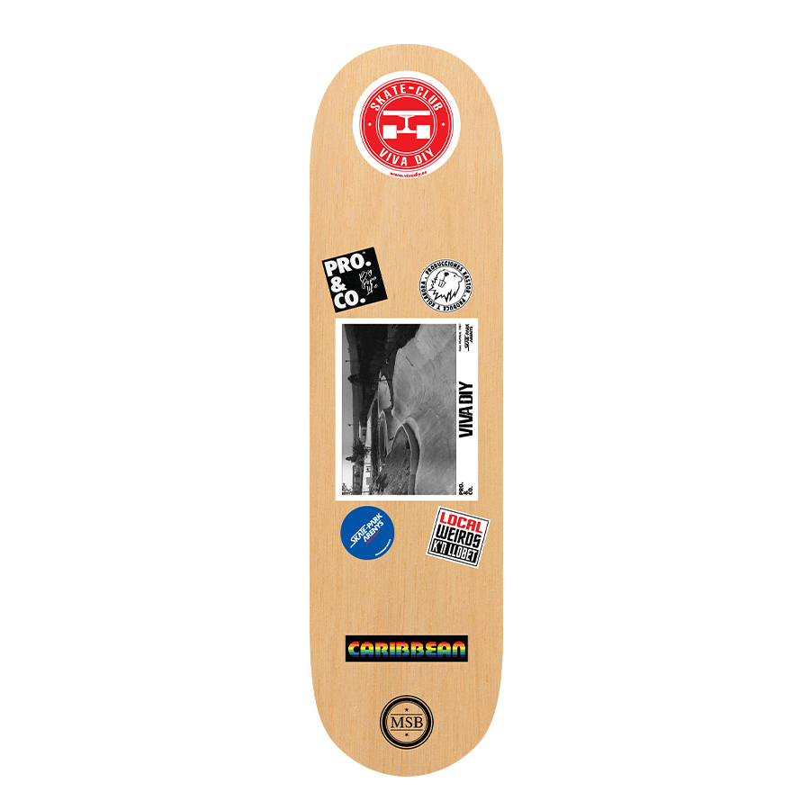 El diseño de la mano de Eva Prat con la foto central del Snake, pista tipo americana en su momento de máxima plenitud realizada por los skaters de esa época (Vilpoux), rescata también la imagen de las tablas de entonces de madera natural y con pegatinas retro, haciendo homenaje a “Caribbean” pioneros del skateboard en nuestro país.